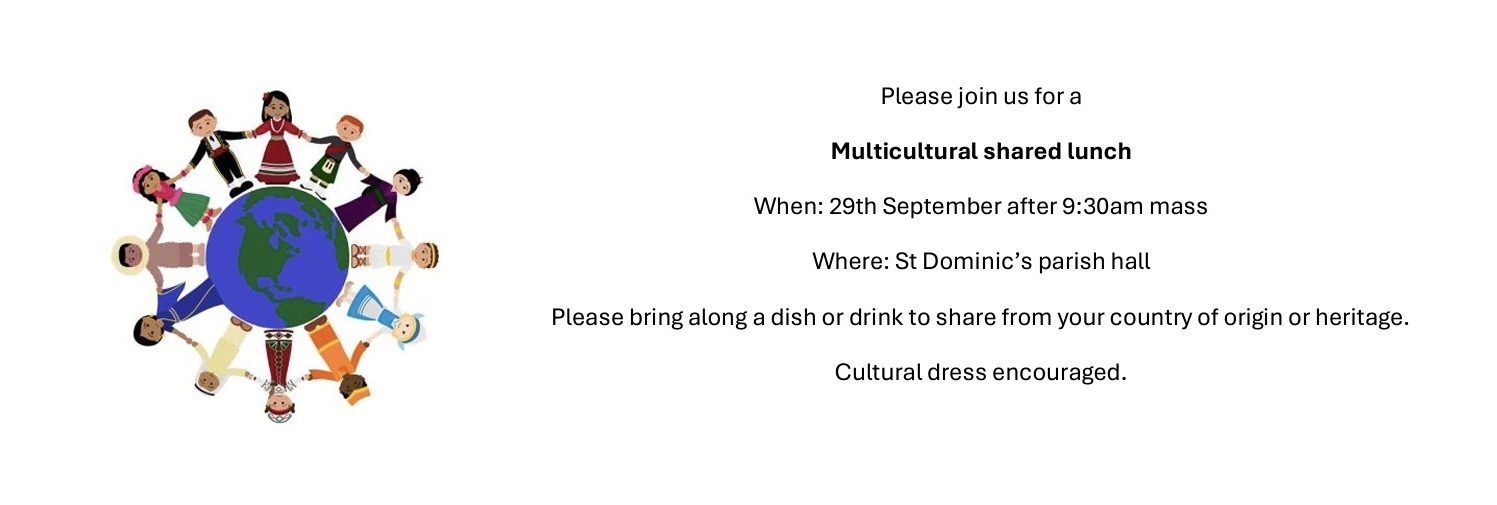 We are celebrating WDMR on Sunday, 28th September. Parishioners are encouraged to come to 9.30am Mass at St Dominic’s in cultural dress. Please check the sheet at the back of church and let us know if your country of origin is not yet listed so we can ensure we have a flag displayed representing your cultural heritage! You are invited to join us for a shared Multicultural lunch. This will be on the 29th after the 9.30am Mass in St Dominic’s Parish Hall. Please bring along a dish or drink to share from your country of origin or heritage. Cultural dress encouraged.